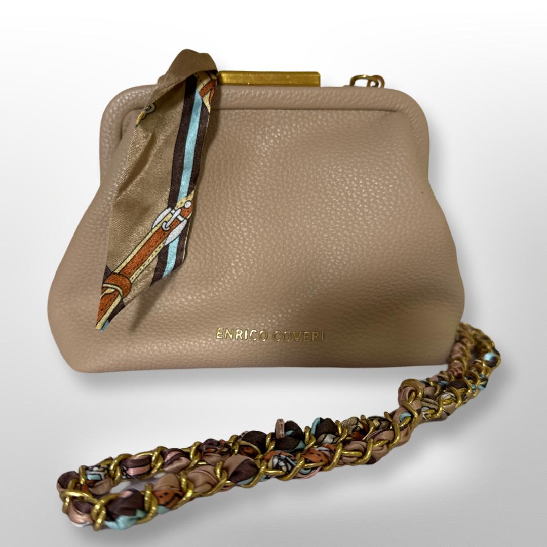 Elegante Taupefarbende Kunstleder-Handtasche mit Stoffdetail am Henkel.