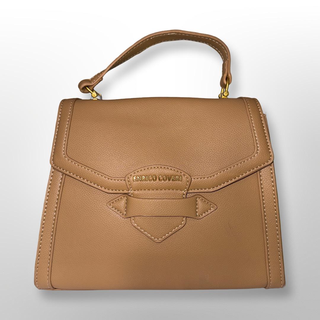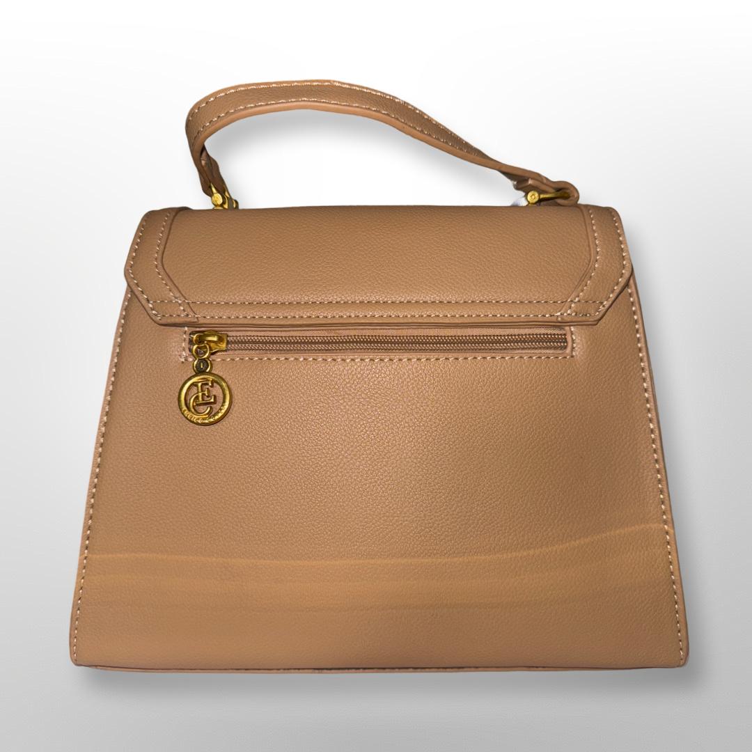 Stilvolle hellbraune Handtasche mit besonderem Verschluss-Detail.