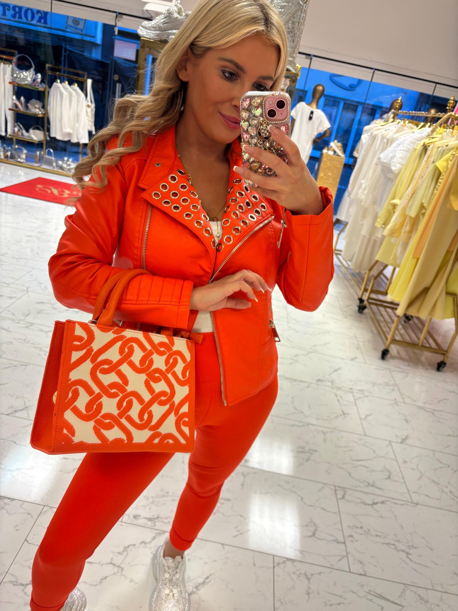 Orangene Kunstlederjacke mit goldenen Elementen.